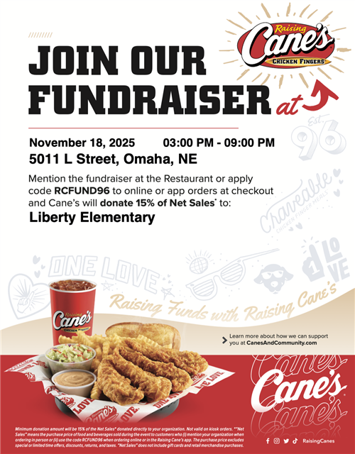 November 18 (3:00-9:00pm). Come enjoy dinner at Cane's to help raise funds for Liberty.